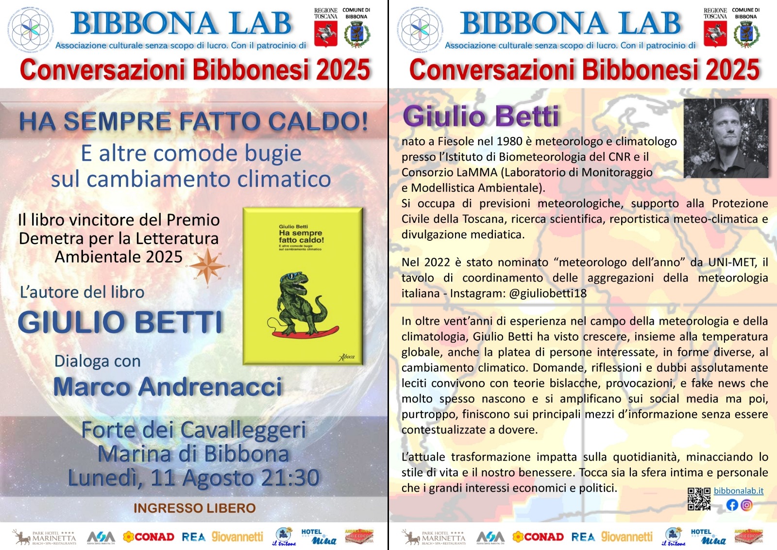 GIULIO BETTI, autore del libro "Ha sempre fatto caldo! E altre comode bugie", dialogherà con Marco Andrenacci. Giulio Betti nominato “meteorologo dell’anno 2022” da UNI-MET, il tavolo di coordinamento delle aggregazioni della meteorologia italiana, a fine della serata sarà disponibile per un firma copia. Il libro vincitore del Premio Demetra per la letteratura ambientale 2025.