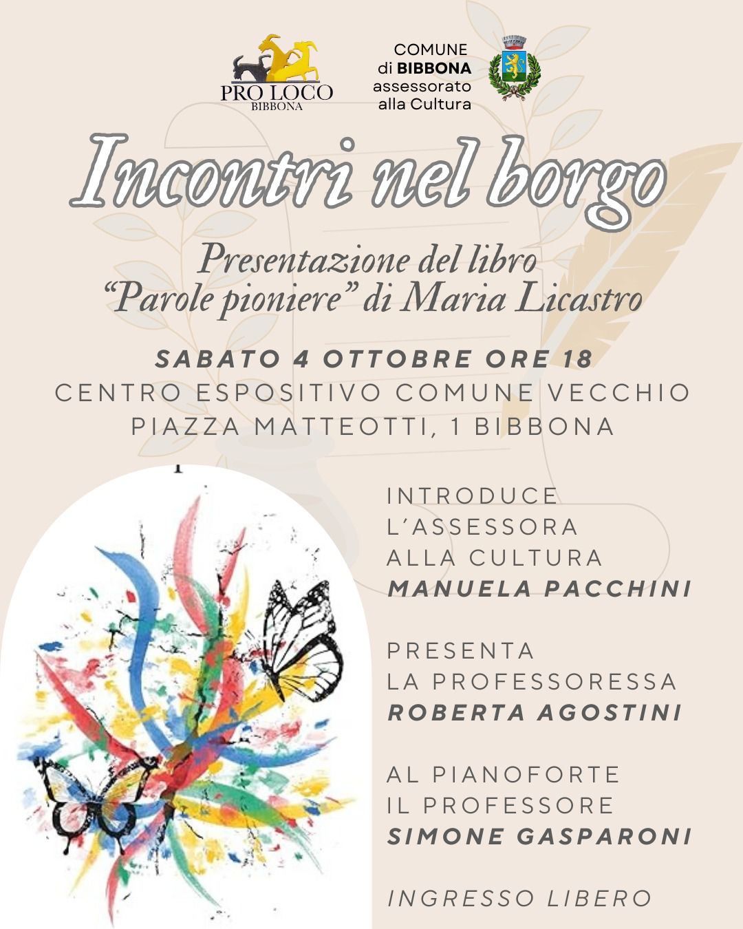 Sabato 4 Ottobre a Bibbona Centro Espositivo Palazzo del Comune Vecchio Piazza Matteotti, 1 ore 18