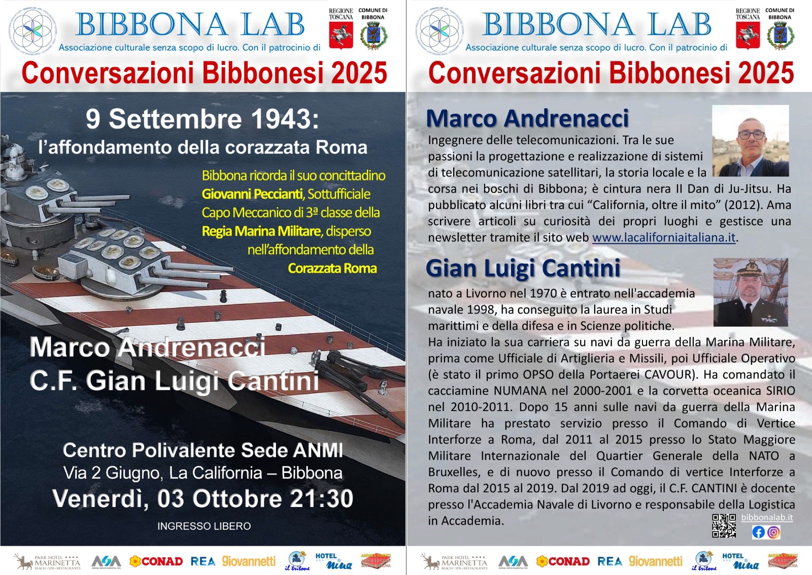 Venerdì 3 Ottobre ore 21.30 a La California (LI) Via II Giugno, presso il Centro Polivalente Sede ANMI, per il ciclo Conversazioni Bibbonesi, Marco Andrenacci e C.F. Gianluigi Cantini presentano